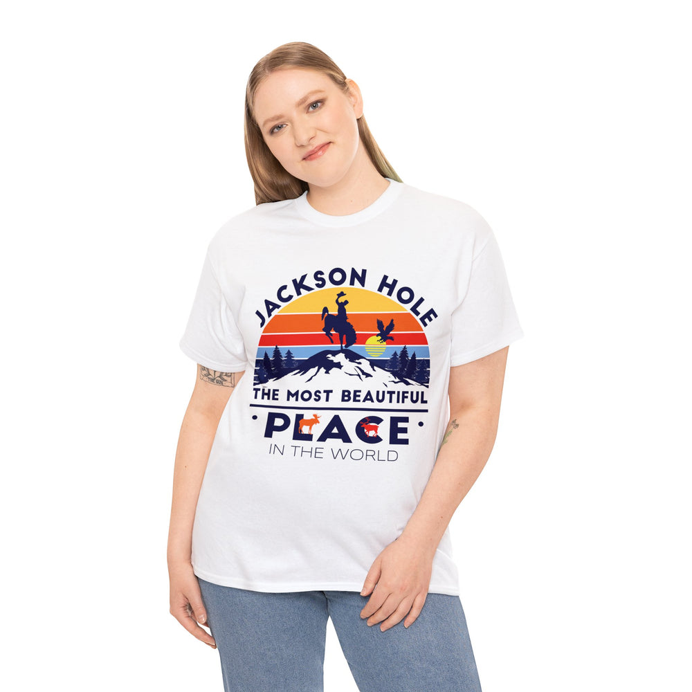 Searching for a unique t-shirt design? Look no further. Our contemporary designs are perfect for any occasion. From humorous to fashionable to traditional - our Jackson Hole The Most Beautiful Place In The World Wyoming Heavy Cotton Tee is created for Wyoming travelers to have a memorable moment. These tees feature a range of graphics to represent the state's beauty.
