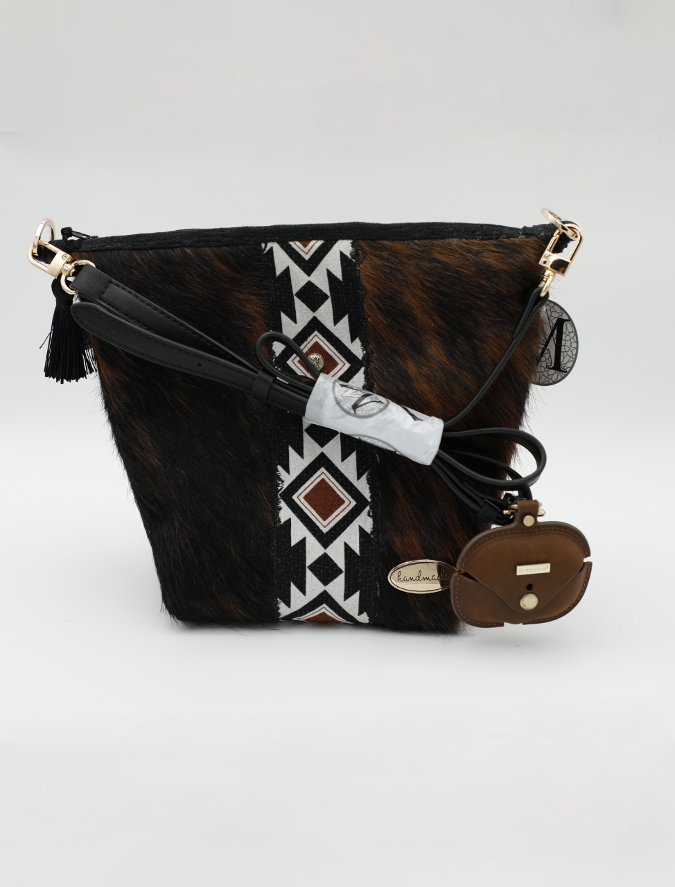 The "Midnight Mesa" handbag captivates with its striking blend of black and brown hues, reminiscent of starlit desert skies and rugged landscapes. Adorned with intricate Aztec motifs, it exudes a sense of cultural richness and heritage, making it a true statement piece.