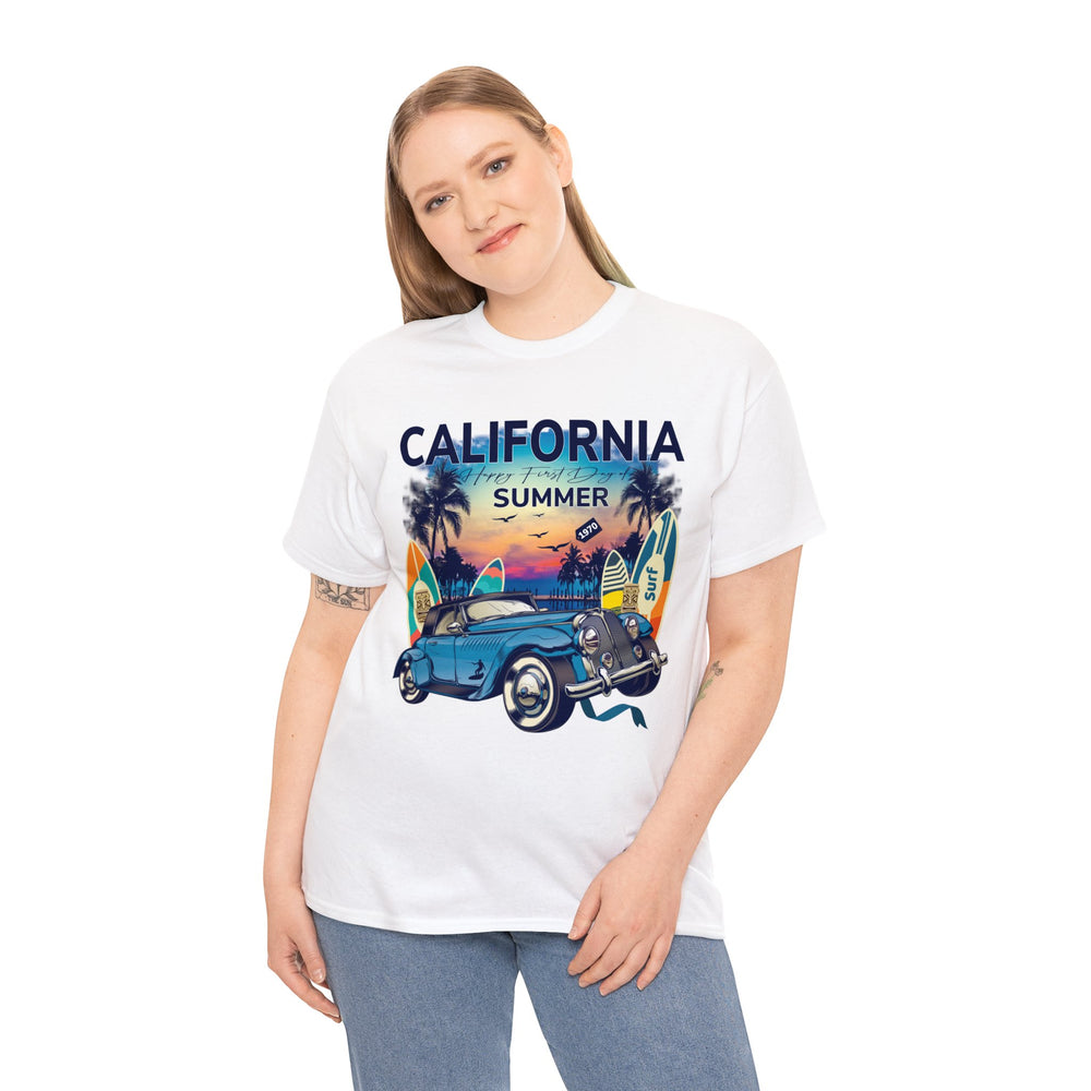 This California Summer Palm Surf Heavy Cotton Tee is a perfect gift for surfers and skaters with a love for Cali and vintage style designs and antique cars. The shirt features a cool vintage purple sky print, suitable for the sunny beach. Ideal for beach days, surfing, boating or simply rockin' the Cali vibes. Get ready for relaxing days with palm trees, beach views and soak up the sun.